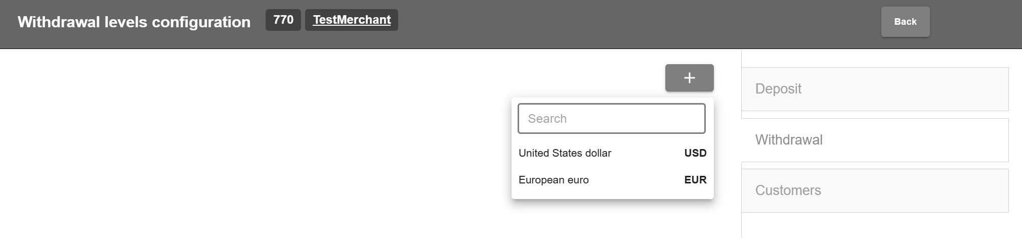 Level configuration can be done for Deposits and Withdrawals. In order to add configurations press + button and select the currency.