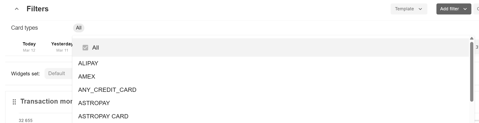 Currencies, payment methods, as well as endpoints, projects and other data can be specified for analysis. Here is the example of the payment method selection to construct the chart: