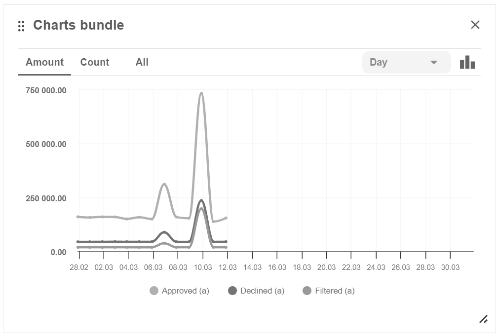 The graph shows the proportions between successful, declined and filtered transactions for a selected period of time.