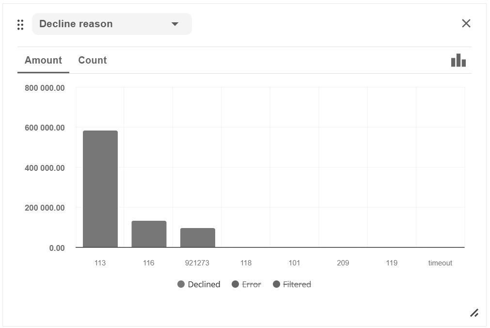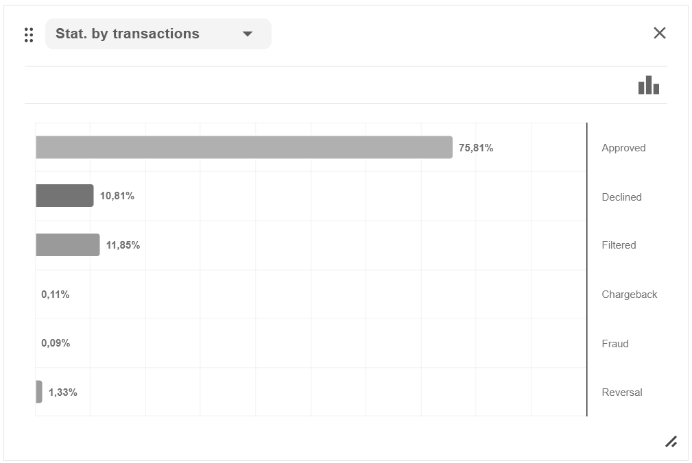 This statistics screen can be used for a visual assessment of the most frequent decline reasons, as well as chargeback and fraud reasons.