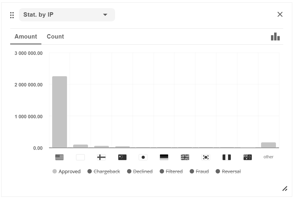 button: the ratio by volume of transactions or by amount of payments, as well as by type of transactions (sale, capture, transfer, etc). SBC Payment Gateway also displays statistics on negative activity and earnings.