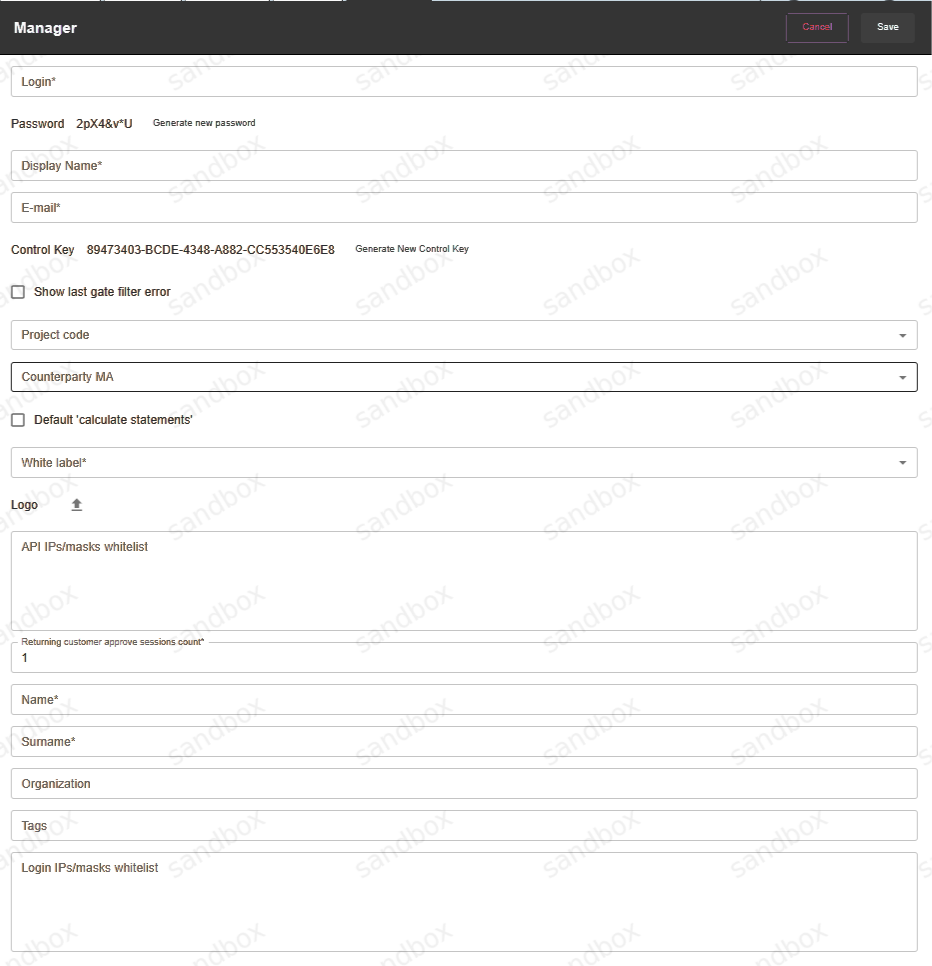 SBC platform contains integrated calculation system to reflect the tariffication between business process partners. Calculation happens on each level, from dealer to merchant. Bank fees are calculated for tariffication and settlement, but statements for settlement with the bank are not provided by the system. Instead, the system calculates statements per Merchant and indicates which exact amount should be received from the bank. Statement is individually generated for each manager or each merchant of this manager. Statement date is called business day. Statement for business day contains all projects for chosen manager. Statements will be calculated for manager if such option is enabled. If statement should be calculated, enable the Default calculate statements flag in manager account details. If this option is not enabled, statements setting in projects of exact manager will be unavailable and statements are not calculated.