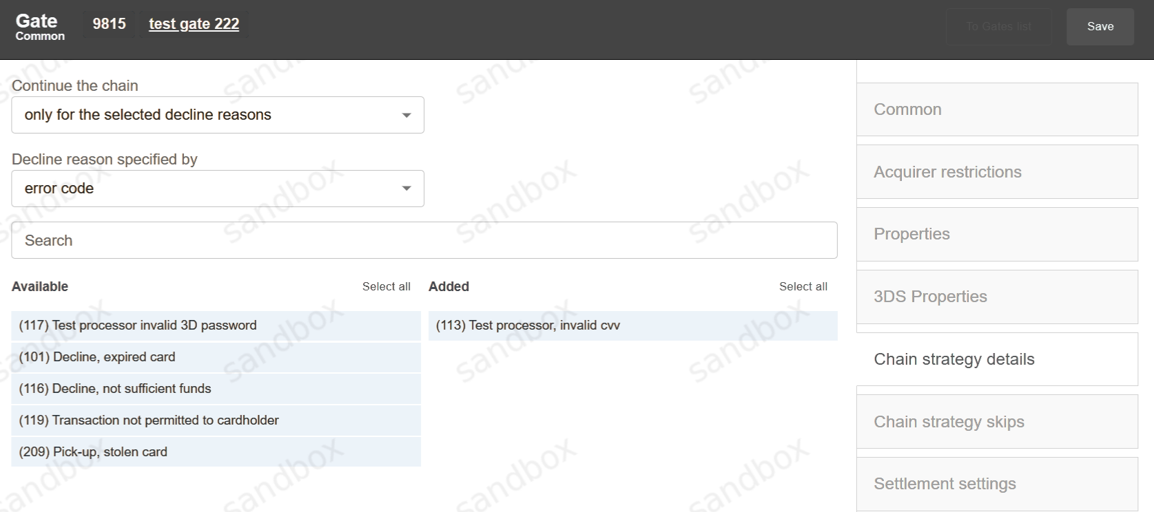 If the configured routing has such balancing types as: Chain by Sequence, Chain by Equivalently on Tx Count, Chain by Coefficient on Tx Count, it’s possible to go to the “Chain Strategy Details” tab on the gate level and select the criteria to continue or stop the chain.